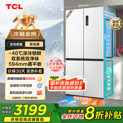 TCL大无界520升T15十字四开门双系统双净味594mm超薄平嵌电冰箱国家补贴风冷无霜一级能效R520T15-UQS目前活动价:3519.2元!