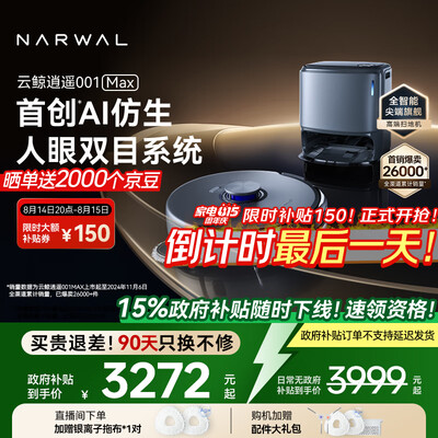 云鲸【政府补贴】扫地机器人逍遥001Max 扫拖一体自动清洗全自动拖地洗地地机 机械臂外扩0缠绕 水箱版目前活动价:3331.15元!