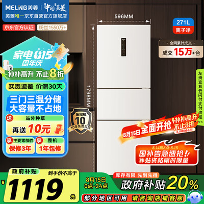 美菱(MeiLing)离子净271升三门冰箱三开门家用变频一级省电风冷无霜宿舍租房小户型冰箱BCD-271WP3CX白国家补贴目前活动价:1399元!
