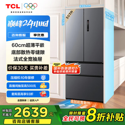 TCL 503升T9法式多门四开门60cm超薄平嵌底部散热大容量家用电冰箱风冷无霜一级能效双循环R503T9-DQ目前活动价:2639.2元!