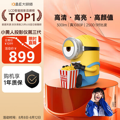 大眼橙小黄人投影仪家用 卧室投影机 真1080P高清智能家庭影院(300lm高亮 自动对焦 )目前活动价:899元!