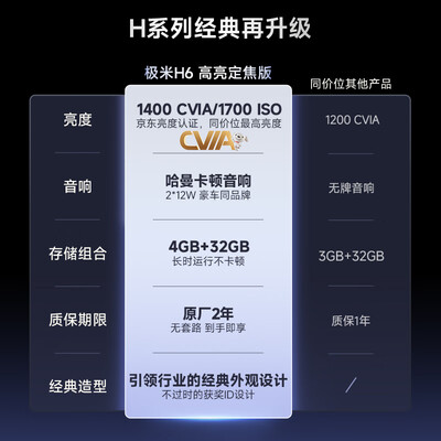 极米H6哪个好?有啥区别?极米H6投影仪到货了,外观好看,画面特别清晰,音质音效都非常的好,操作简单,手机电脑都可以无线投影,特别方便!非常喜欢自动矫正这个功能,而且画面很清晰不卡顿,买来放卧室真的非常方便,不用幕布也很清晰,真不错?萌萌的大眼睛,操作简单方便,投在白墙上已经很清晰了,就等我的电影幕布了,哈哈手机投屏看节目的时候挺顺畅的,关灯看视频的时候还是挺清晰的,还送了幕布和地面支架流明度没有虚标,整体效果还是不错的,对比了 款同价位的投影仪,因为一直用着的电视所以选择了这款投影仪,