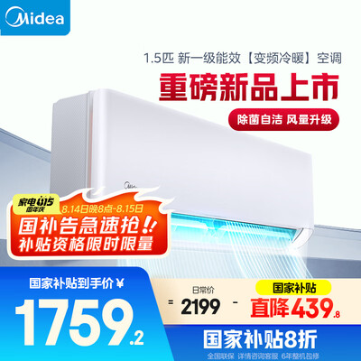 美的空调挂机大1.5匹 P1挂机 一级能效 家电国家补贴20% 变频冷暖 同级冷静星3代 KFR-35GW/N8HX1-P1目前活动价:1758.4元!