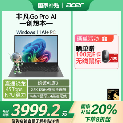宏碁(acer)非凡Go ProAI 国家补贴20% 轻薄本 14英寸高通笔记本电脑学生办公(骁龙XElite 16G 1T 2.5K 120Hz)到手价格4999元。