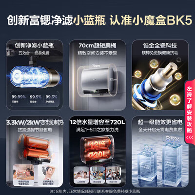海尔BK5和海尔BK7哪个好?区别是什么?说真心话这两款海尔BK5和海尔BK7区别不大的哈,款式是差不多的,只是说海尔BK5比较精致,不过还是得看个人喜欢吧,我自己用的是海尔BK5,款式是我喜欢的,多时尚的 ,真心不错, 最重要的是这款海尔BK5做工很细腻,说真心的这款海尔(Haier)国家补贴20%双胆扁桶电热水器60升麦浪BK5 富锶小蓝瓶净肤洗 内胆免清洗 3300W速热家用一级能效个人使用体验后觉得的确是蛮不错的哟,不错.双十一前买的!师傅安装也是超级快的,用了一段时间才来好评.外观设计简单大方!加热也是非常快,重点是远程操控也是非常方便!整体来说还是非常满意 海尔BK5体积小巧,颜色要是有白色就更完美了,加热速度很快,安装师傅很好,温度足够,适合人少的家庭。注意安装配件是需要另外付费的。 安装的很好,热水器也很好,一直喜欢海尔BK5的热水器,很耐用 外形外观:漂亮加热速度:很快用起来非常简介,智能,人走息屏,安装师傅也很迅速,非常美好的体验。 帅气的安装小哥,漂亮的热水器。师傅很耐心有一点不平衡都要调整好。 热水器收到了,质量很好,送货上门,安装师傅很快就按好了,非常满意好评!