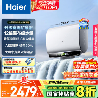 海尔(Haier)国家补贴20%双胆扁桶电热水器60升麦浪BK5 富锶小蓝瓶净肤洗 内胆免清洗 3300W速热家用一级能效目前活动价:2439.2元!
