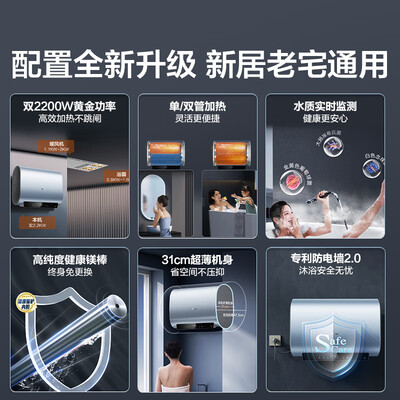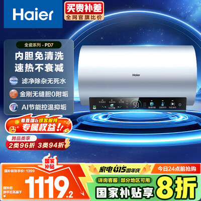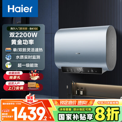 海尔(Haier)国家补贴20%双胆扁桶电热水器60升 BK1SE 双2200W黄金功率速热一级能效节能 家用超薄储水式大水量目前活动价:1399.2元!
