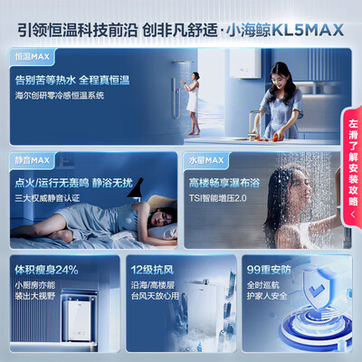 下单后很快就收到了,师傅上门安装速度也快,热水器质量很好,外观漂亮,启动也快,温度可以自由调节,非常不错热水器很好用,外形也很美观大方,已经用了快一个月了,用了我才来评价的,安装师傅也很好,安装也很方便热水器装好了,白色的很漂亮。海尔小海鲸KL5GT之前也用过,质量还是不错的,诚心推荐。发货速度非常快,快递也很给力,给送上楼,货不错,售后跟得上!包装完好无损,物流快捷,安装神速,今天12点50送到,下午3点半完成既可使用,十分满意!点赞!