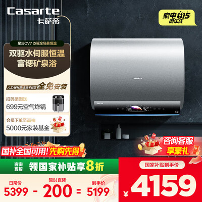 卡萨帝CV7热水器安装好了,试机没有问题,安装师傅的态度非常不错,及其耐心与细心,安装完成后还通电试了热水器的加热,没有问题才走,推荐购买。外观大方,操作简单,安装很容易,打400免费电话预约安装,发货速度神速,第二天就到了,热水器卡萨帝桃花水PROH3值得信赖的品牌自己安装很方便,官方的安装很奇怪,货没到,没报装就有师傅打电话。热水器挺漂亮的,功能强大,简单好用,赶上大促,物流慢了点,其他没毛病。机器很好看,很大气,用起来得心应手,安装师傅非常有耐心,一直再教导,非常完美地购物体验,信任卡萨帝桃花水PROH3,非常不错。