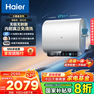 海尔(Haier)【咨询客服领国补】电热水器BK3扁平式家用扁桶一级能效节能双胆3300W速热镁免WIFI智控小魔盒系列 60L 3300W 小魔盒净肤洗BK3S目前活动价:2079.2元!