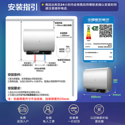外观样子非常美观,颜值非常高,安装师傅的手艺超级赞,安装的特别好,太满意了!选择这个热水器真是选对了!送货小哥很好,提前打电话了,楼梯送上四楼也是辛苦了,安装师傅也很好,主动打了好多次电话预约时间,买电器还是京东方便,支持看这还是不错; 2级节能; 性价比超高; 推荐购买;刚刚装上; 用一段时间在看看是否耐用;一切都挺好的,安装师傅非常用心,不错的一次购物新房装修买的,京东的物流很快,第二天就安排安装了,安装的师傅很仔细,认真负责,上水很快,加热也很快,加油?