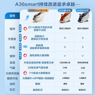 荣泰按摩椅A36smart哪个好?有啥区别?荣泰按摩椅A36smart按摩椅收到了,按摩效果非常好,全身都能按摩,对腰部的按摩特别舒服,希望能够一直用下去功能多样,用着很舒服,给老婆买的,每天下班回来按一下,特别萌缓解疲劳。非常推荐~pro卡机色和原来的芝华士沙发,颜色很配,协调。功能以后慢慢试。荣泰按摩椅A36smart的小按摩椅,外形小巧,品质优异,使用舒适,蛮好!值得推荐!收到马上就试了一下,力度很满意,送给爸爸妈妈他们特别喜欢,物流直接送到家,喜欢的可以下手啦