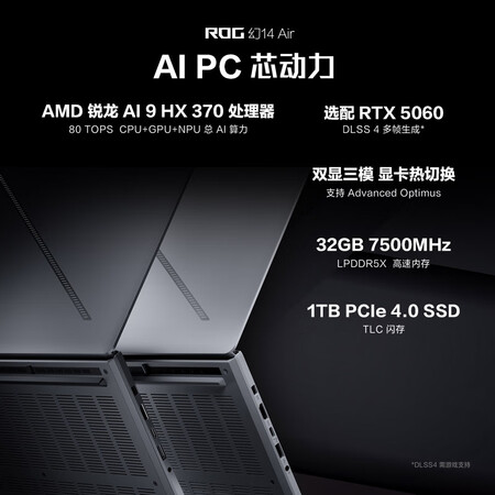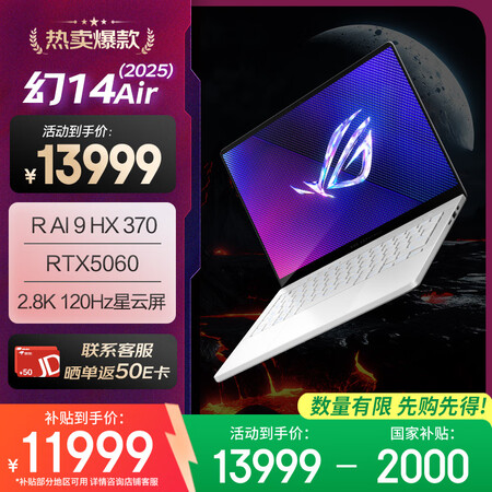 ROG幻14 Air 2025 14英寸设计师轻薄游戏本笔记本电脑(锐龙 AI 9 HX 370 32G 1T RTX5060 2.8K)铂月白目前活动价:13999元!